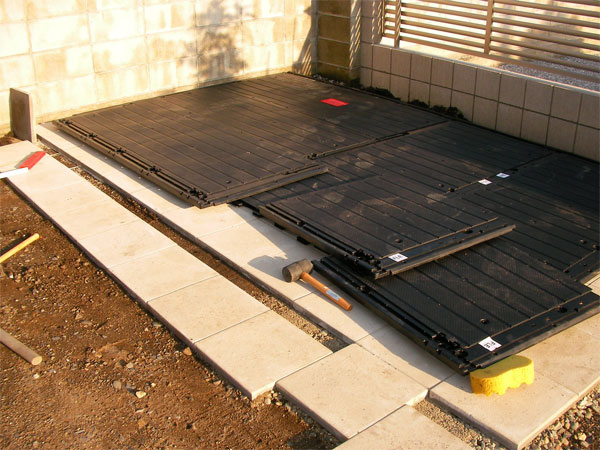自分の場合、設置場所を整地して30cm角のインターロッキングを敷き詰めました。