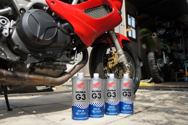 いつもの、ホンダ純正オイルのじーさんを4本注入。