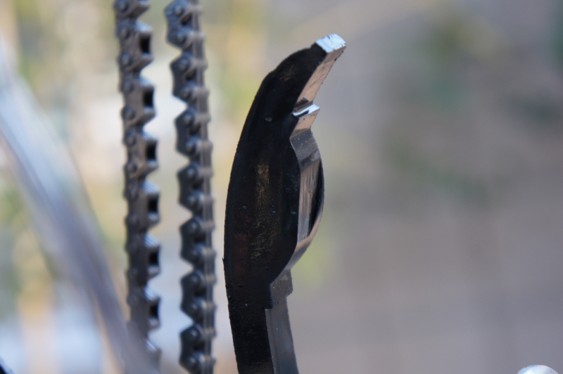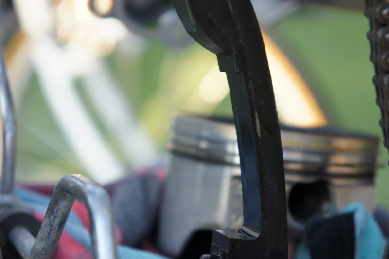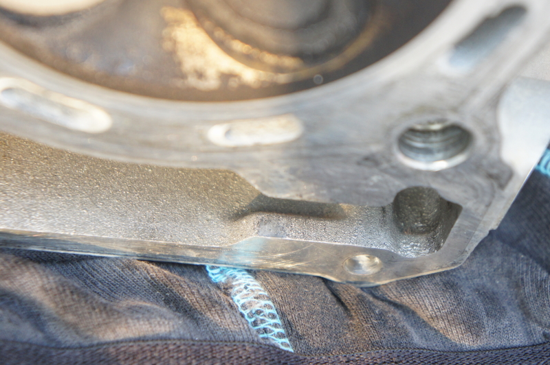 おっ、カムチェーンテンショナーが当たるところが結構変形しちょる。