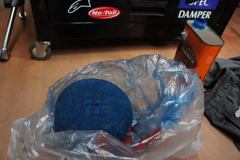 写真左側の、ツインエアーのフィルターオイルを少しずつ全体に着けていく。