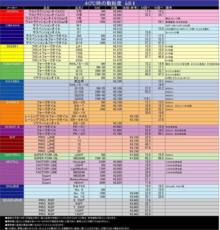 みつけたフロントフォークオイル粘度比較表