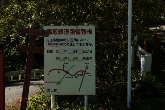 川俣湖の橋を渡って、いざ馬坂林道へ!と思ったら、ゲート閉鎖&台風の影響で工事中通行止めの標識が・・・