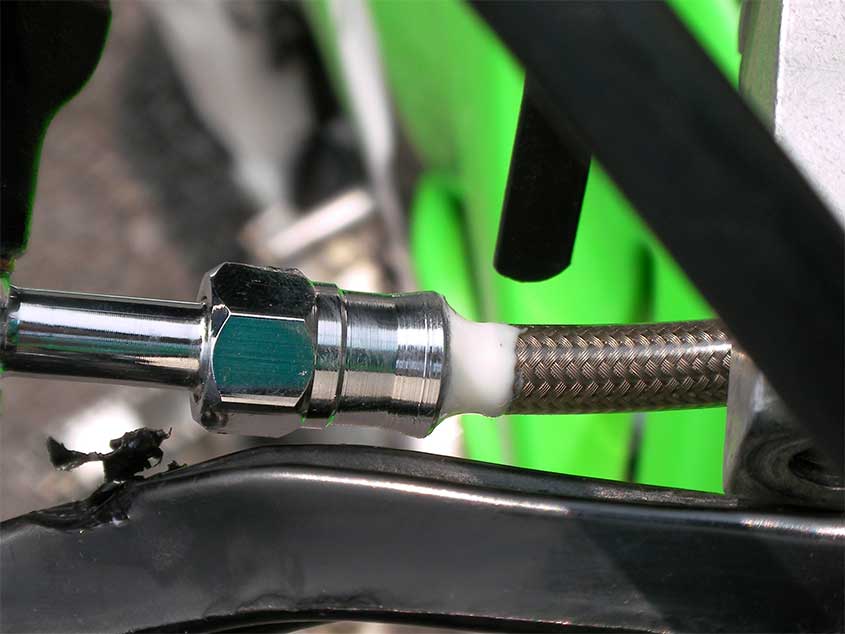 白いのはシリコン系シーラーです。カシメ部とホース部の隙間を埋めています