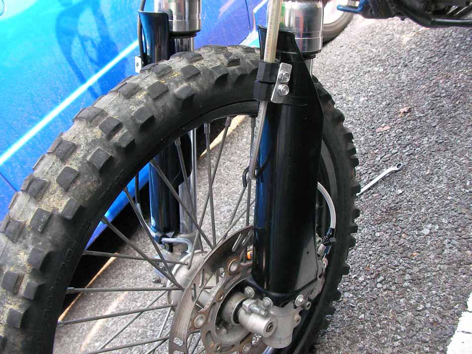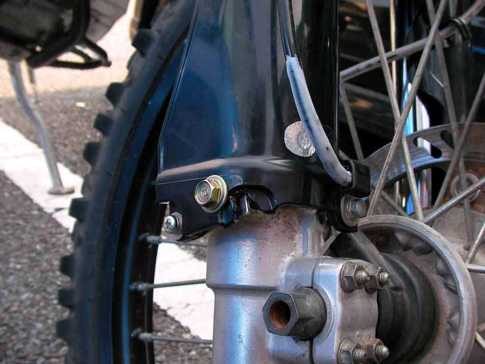 背景:KLXのフロントブレーキホースは、フロントフォークの下を通っているレイアウトなので